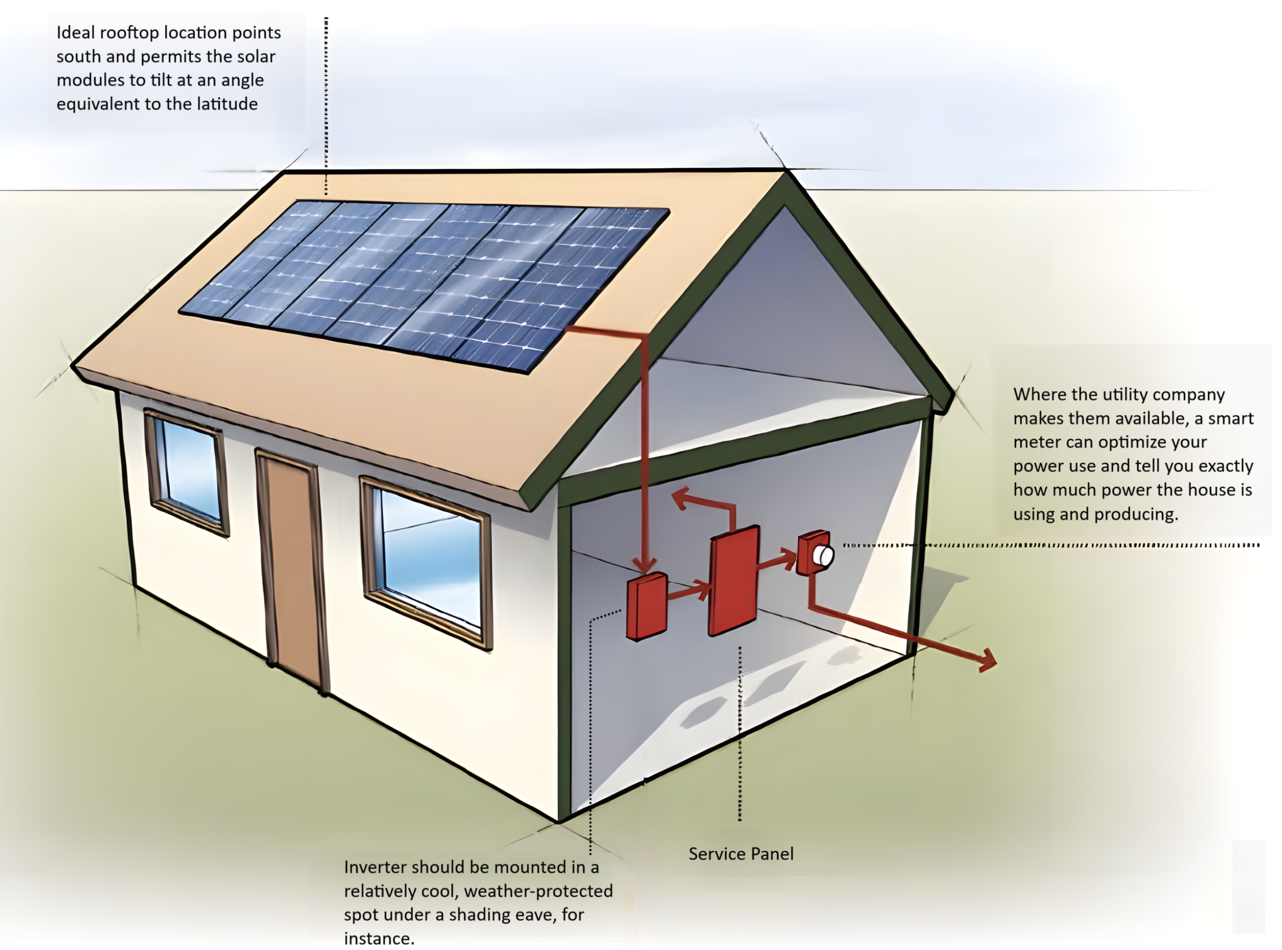For residential applications, PV falls into two main categories. First is grid-tied, where the home generates its own electricity but can also draw power from the utility company at night. The second is off-grid, where the home must generate its own power, storing energy in batteries for use at night.
