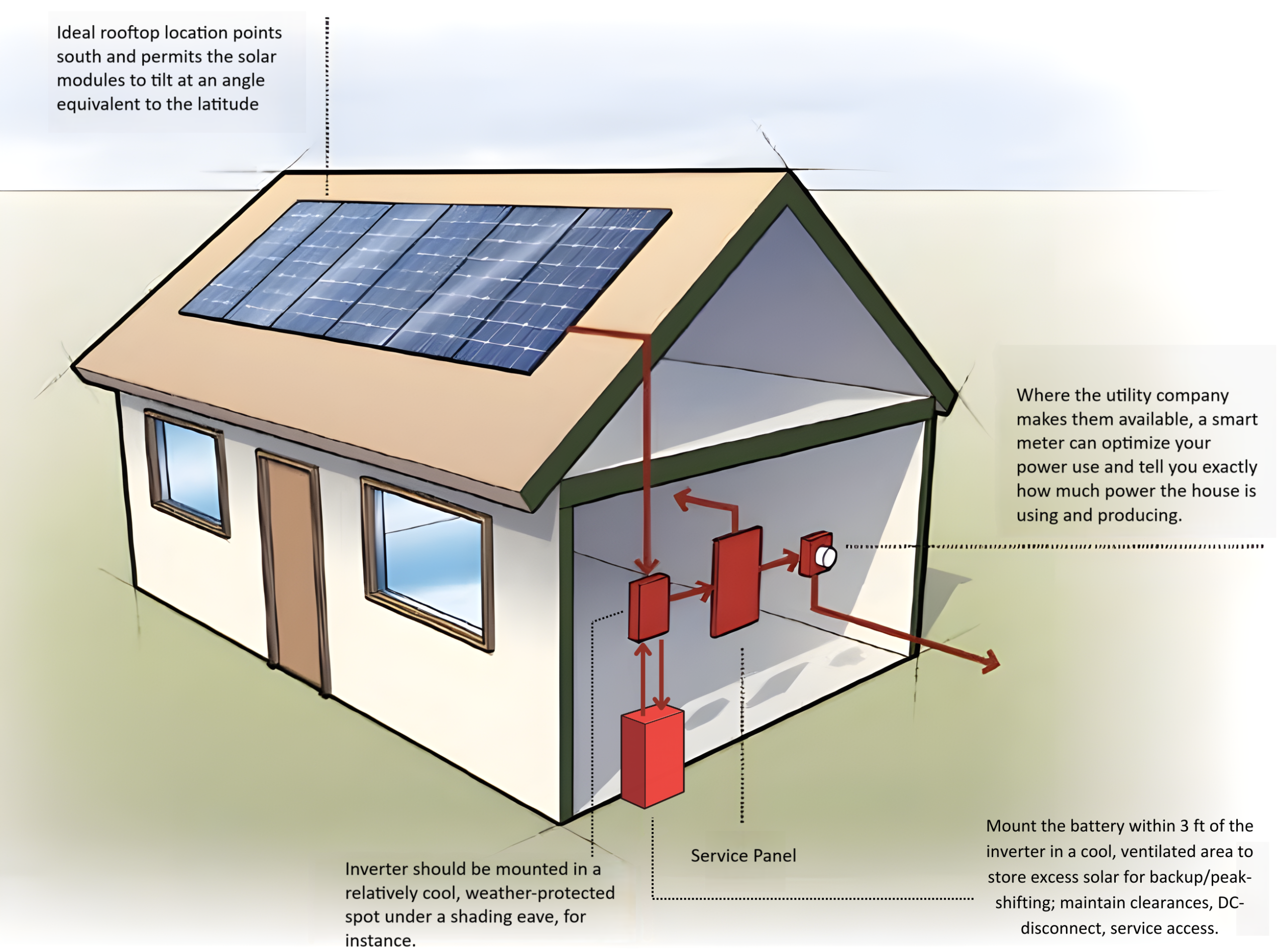 Location is critical to PV performance. The array should face the sun. This usually means due south, though if you have a heavy air-conditioning load in the late afternoon, you may want to point the array southwest. The array should not be shaded during any part of its productive day. The array should be tilted upward at the correct angle to optimize seasonal exposure — typically at the angle of your latitude so it gets sunlight at a right angle at the spring and fall equinoxes. Some arrays can be made adjustable for varying the angle at different seasons. If the array needs to be elevated above the roof surface, it places additional uplifting loads on the roof structure during windstorms. If the roof doesn’t offer a suitable structural surface, consider a ground-mount array in the yard or a solar pergola.