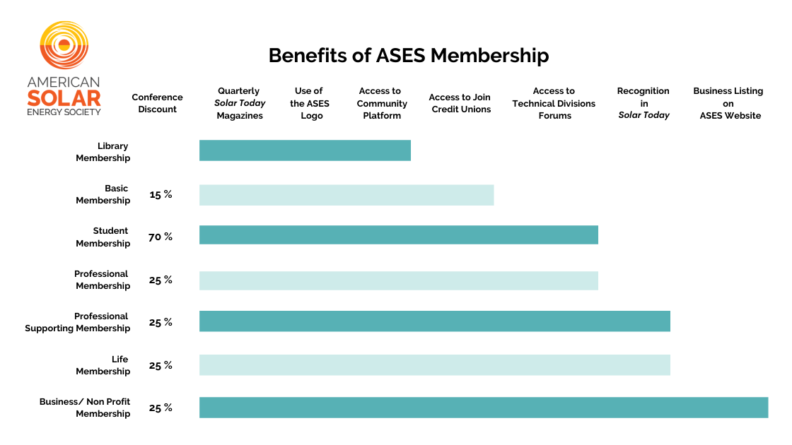 Our members receive complimentary copies of the award-winning, quarterly Solar Today magazine, access to the Clean Energy Credit Union and others, access to the ASES Online Community, and discounted access to events such as the annual National Solar Conference. Various levels of membership also include access to experts through ASES Technical Divisions, recognition in Solar Today magazine, and official use of the ASES logo for websites or brochures.